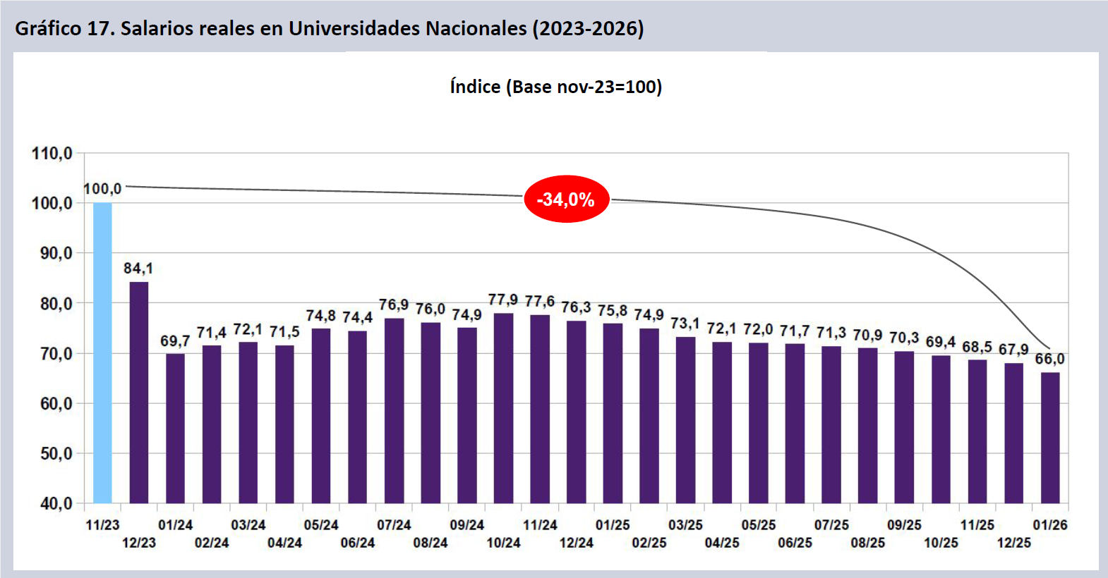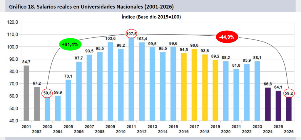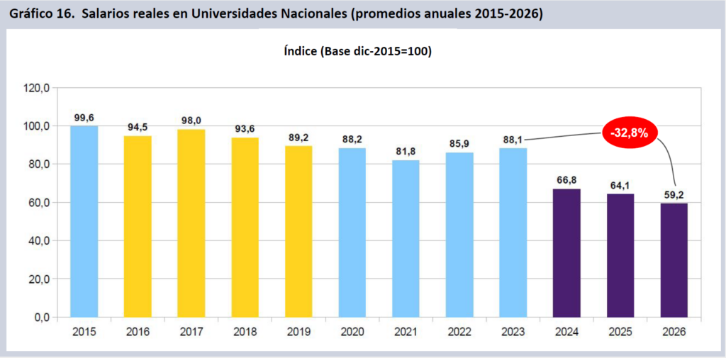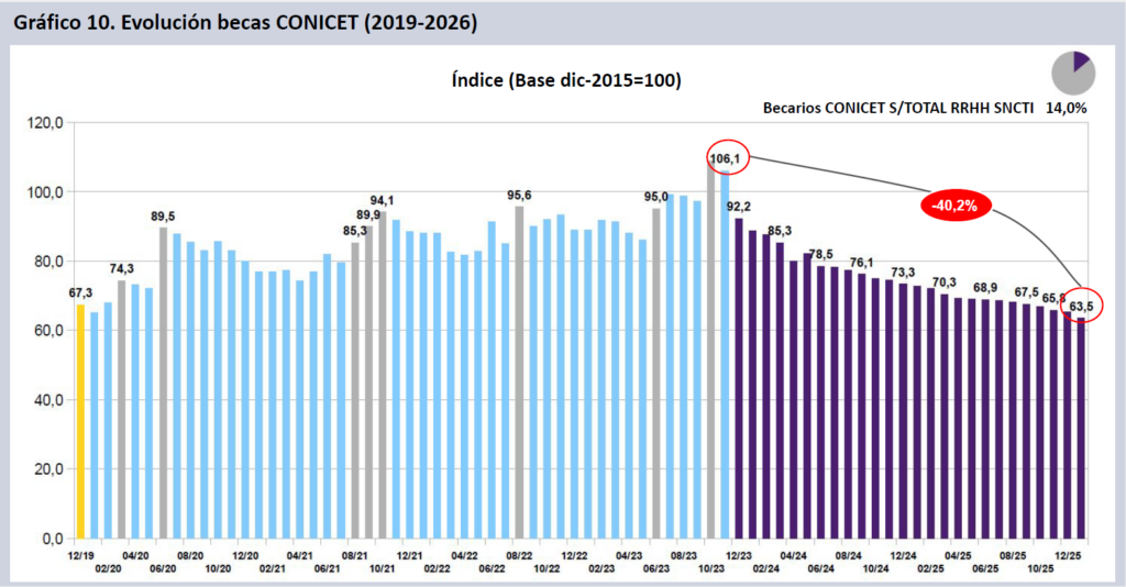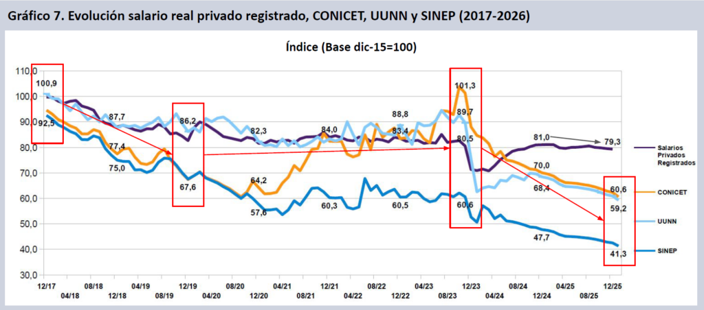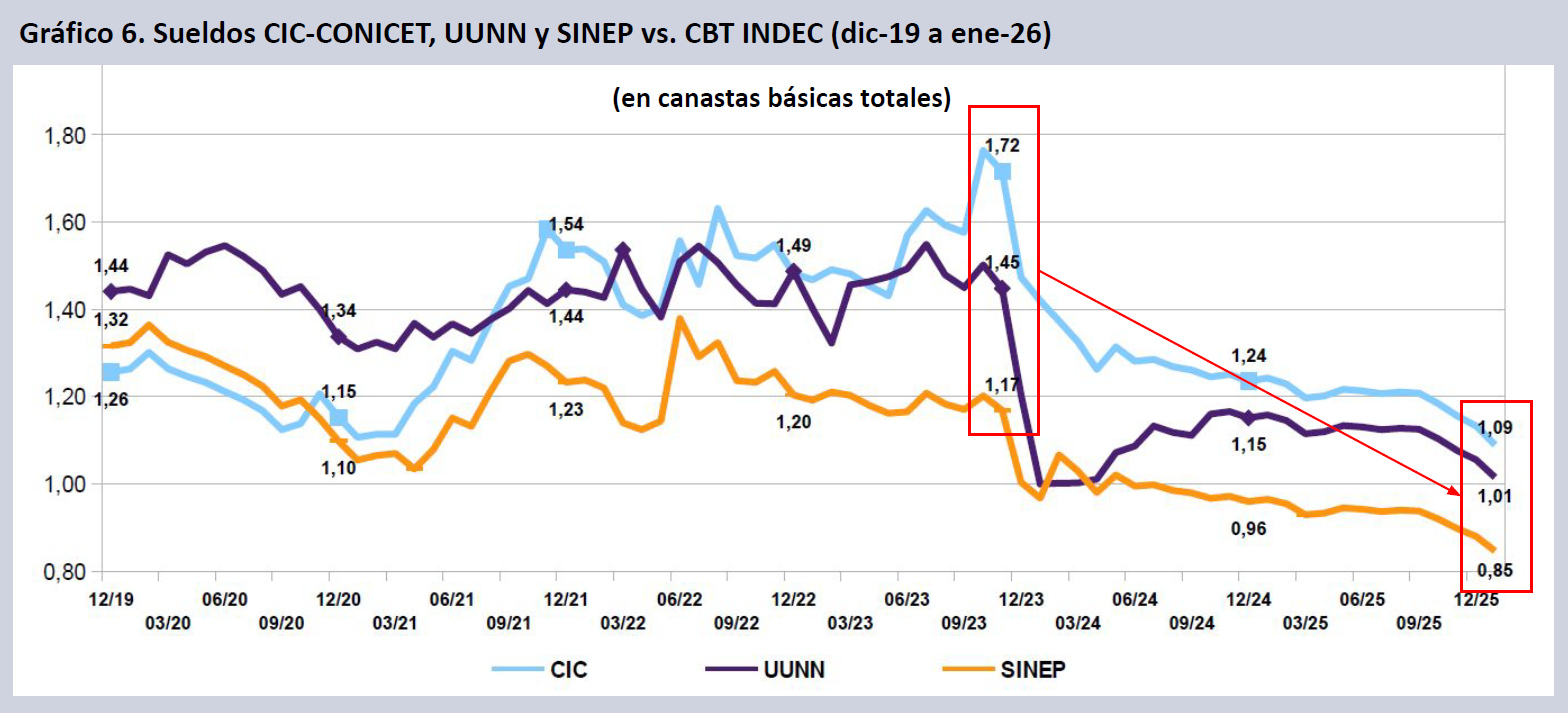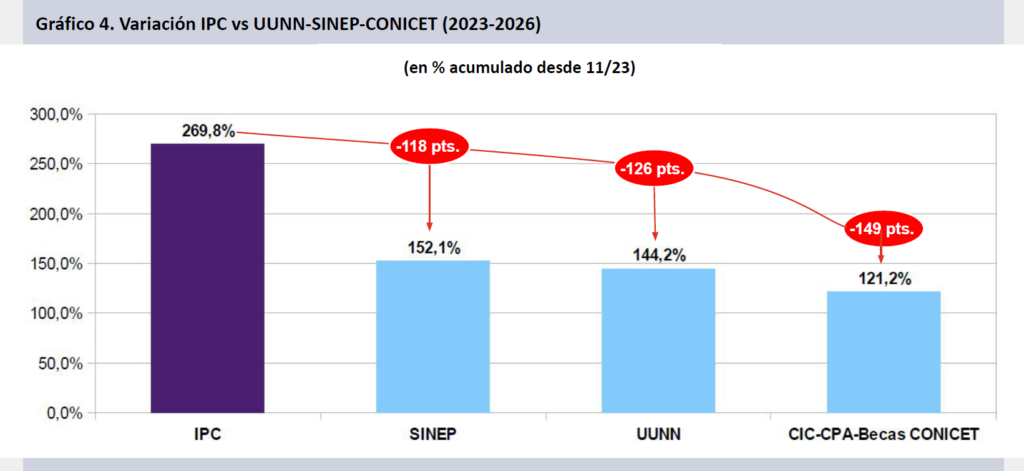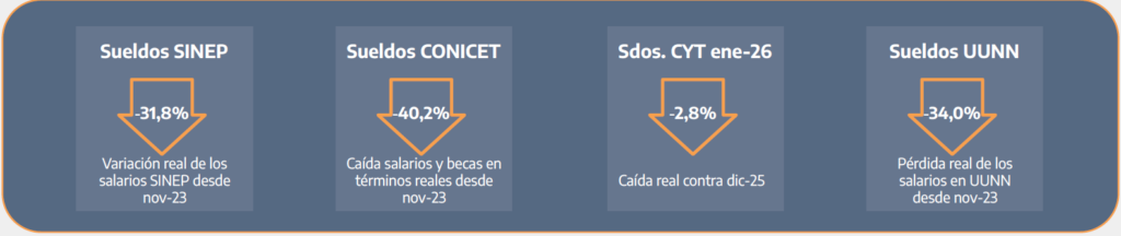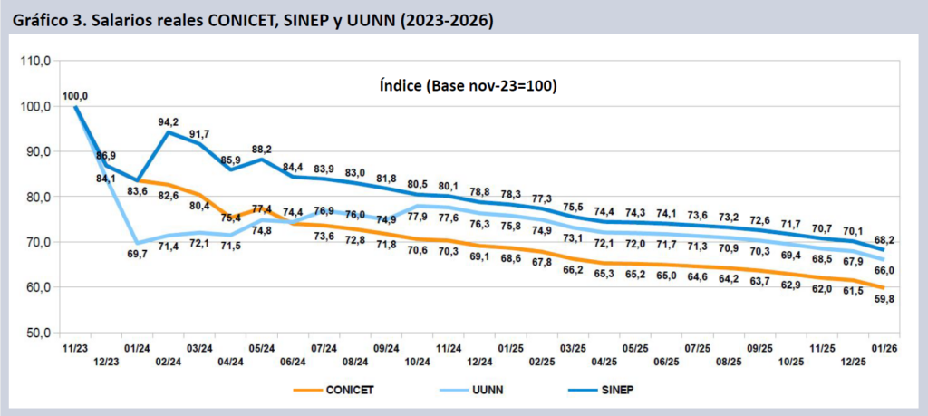 A enero de 2026, tomando como base el mes de noviembre de 2023, los salarios CONICET (CIC-CPA y Becas) caen punta a punta en dos años y dos meses de gestión un 40,2% real, docentes investigadores en UUNN lo hacen un 34,0% y el escalafón SINEP un 31,8%.