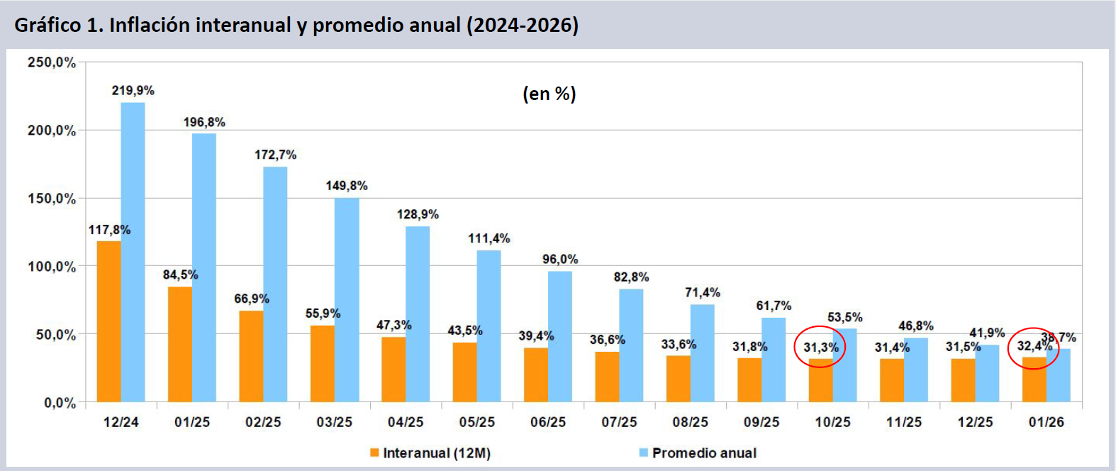 El Índice de Precios al Consumidor (IPC) del INDEC continuó por octavo mes consecutivo en su senda ascendente (mayo 1,5 %; junio 1,6%; julio y agosto 1,9%; septiembre 2,1%; octubre 2,3%; noviembre 2,5%; diciembre 2,8%), al alcanzar un 2,9% en enero. Esto ubica la inflación promedio anual en el 38,7%. La inflación interanual (últimos 12 meses) sube por tercer mes consecutivo y alcanza un 32,4% (+0,9%). La estimación del Proyecto de Presupuesto 2026, que es del 10,1% (dic. a dic.), lo que supone una inflación promedio anual del 21,5%, será rápidamente superada.