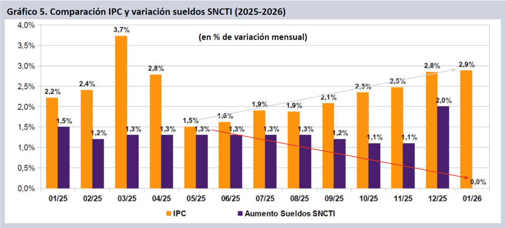 Los salarios en todo el sector SNCTI ven agravada mes a mes su situación ante la evolución discordante de la inflación, por un lado, y los ingresos de los diversos agrupamientos por el otro. Si en el primer cuatrimestre las pérdidas fueron masivas, sobre todo entre febrero y abril, producto de la brusca aceleración inflacionaria, tras la caída de la variación nominal en mayo pareció que ambas variables podrían ir convergiendo. Sin embargo de allí en más el IPC reinició su senda ascendente, incrementándose de manera consecutiva durante ocho meses, mientras la pauta de aumentos dispuesta por la política de ingresos del gobierno hacia el sector derivó en un persistente deterioro. En resumen, de may-25 a ene-26 la inflación se fue deslizando del 1,5% al 2,8% mensual, en tanto los salarios pasaron del 1,3% al 1,1%, con un aumento del 2% en diciembre y del 0% en enero.