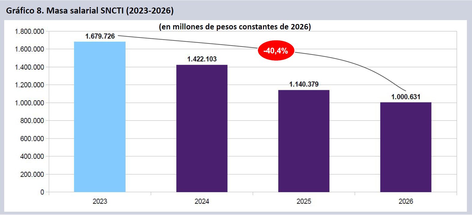 Proyectando sobre la base del Presupuesto 2026, desde 2023 los trabajadores del SNCTI han visto deteriorarse sus ingresos totales en un 40,4% real, lo que equivale a una transferencia sectorial por pérdida de masa salarial de 1.48 billones de pesos (corrientes). La masa salarial se achicó en 257.623 millones en 2024, 539.348 millones en 2025 y se proyectan 679.095 millones en 2026.