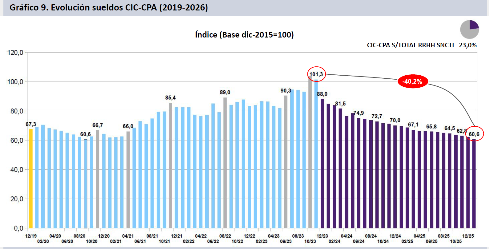 Los salarios de Investigadores (CIC) y del Personal de Apoyo (CPA) del CONICET, que representan al 23,0% del personal del SNCTI, cayeron un 2,8% real en enero. Desde nov-23 se retrajeron un 40,2% real y descendieron un 39,4% en términos reales desde dic-15. Cayeron un 11,0% en 2025.
