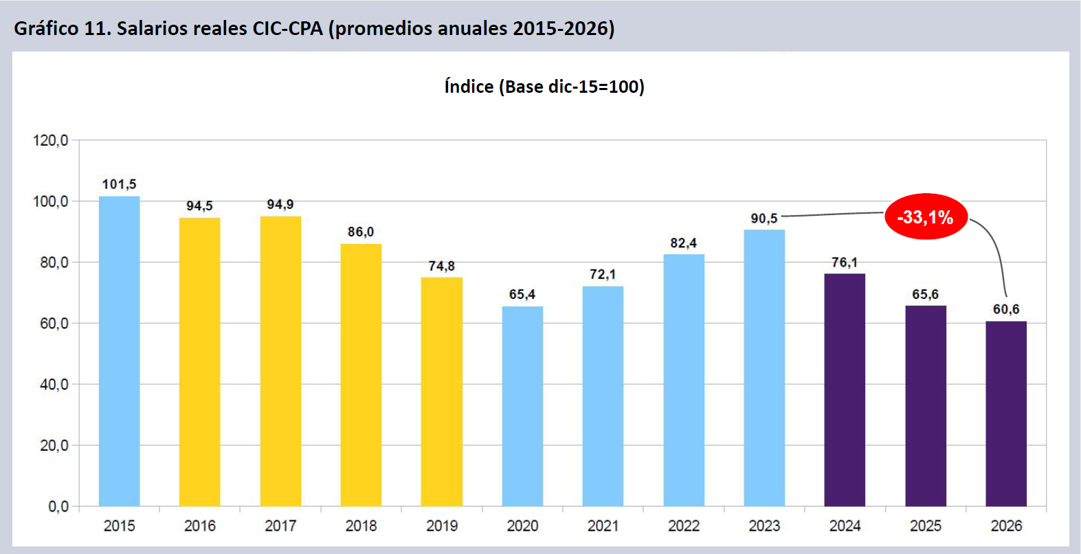 Los salarios reales CIC-CPA, se encuentran un 33,1% por debajo de 2023 en términos reales, cuando se hace la medición considerando los promedios anuales. La retracción de los salarios reales los ubica por debajo de los valores de 2020, revirtiendo los incrementos del período 2021-2023, y situándose 40,3 puntos por debajo del promedio anual de 2015.