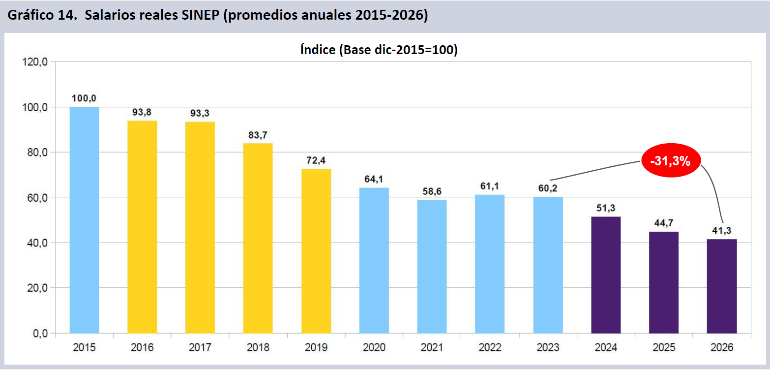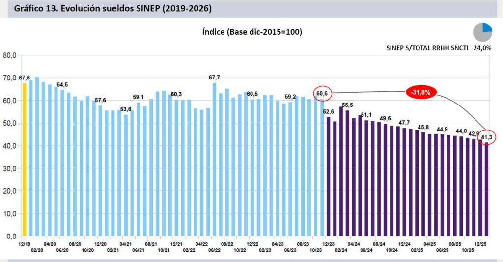 Las remuneraciones del personal encuadrado en el Sistema Nacional de Empleo Público (SINEP; 24,0% del personal del SNCTI) declinaron un 2,8% en términos reales durante enero de 2026, perdiendo 31,8% puntos reales desde noviembre de 2023. Con ello se ubican a 58,7 puntos del nivel de diciembre de 2015. También se deterioraron un 11,0% en 2025.