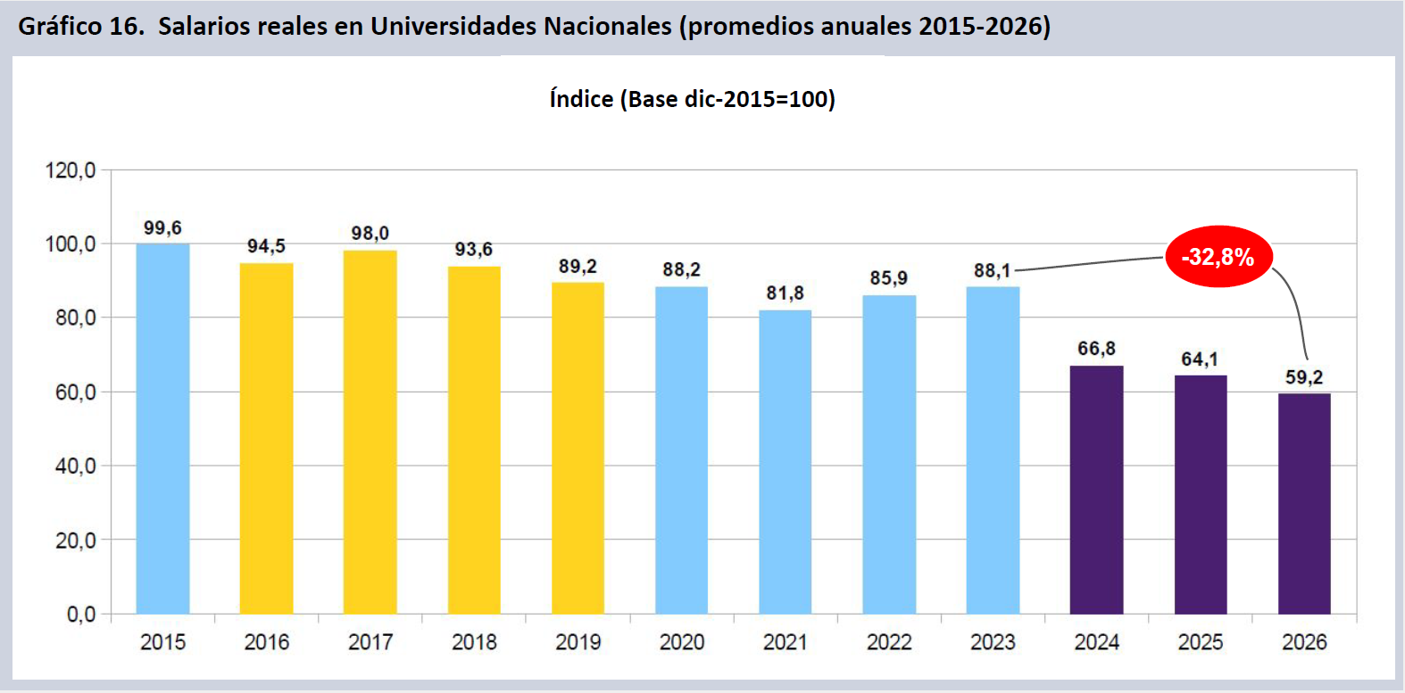 Los salarios reales de docentes e investigadores en Universidades Nacionales, en términos de promedios anuales, en 2026 caen un 32,8% real contra 2023, descendiendo incluso respecto del nivel que presentaron durante 2024. Acumulan con ello una pérdida de 40,6 puntos respecto del promedio que tenían en 2015. Se trata del agrupamiento que tuvo la mayor caída en promedio anual en el SNCTI durante 2024 (24,2%).