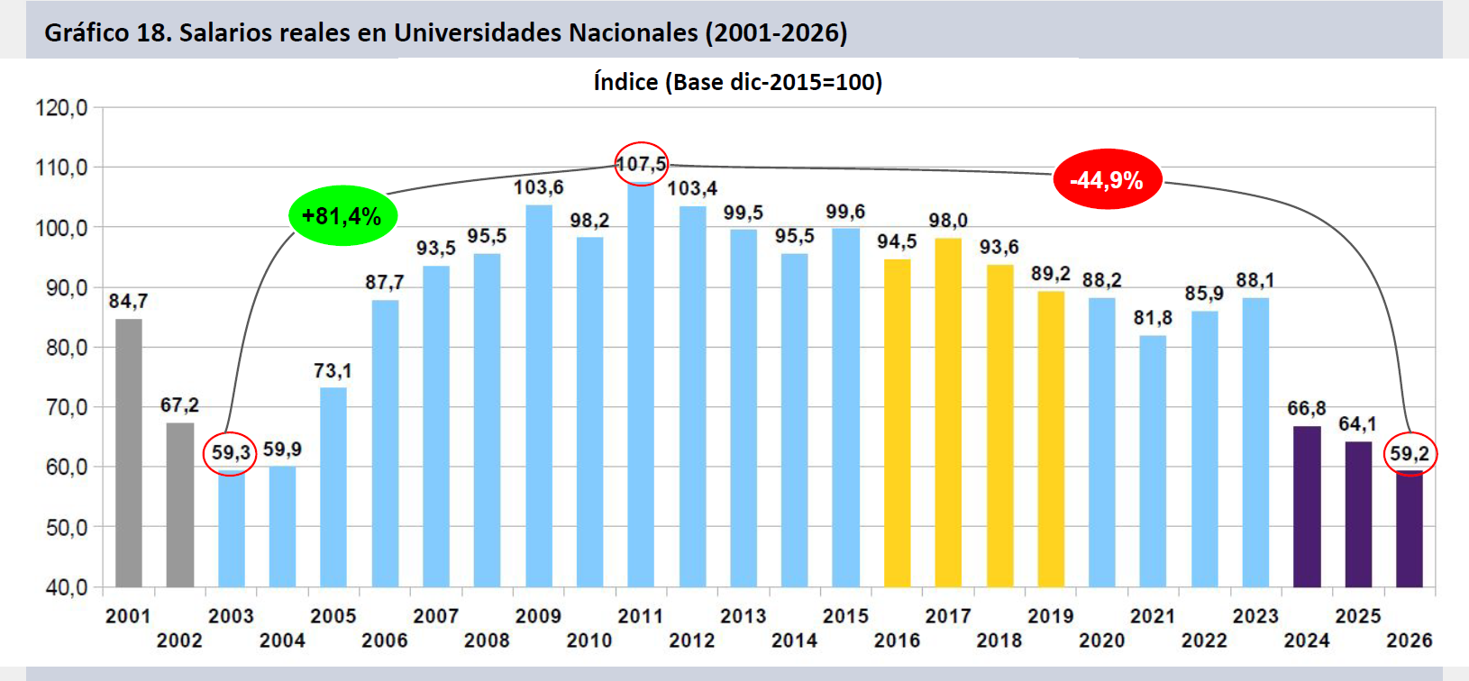 - Los salarios SINEP en ene-26 caen un 58,7% respecto de dic-15. Los salarios universitarios han perdido un 40,8% respecto del mismo mes base, en tanto los salarios CIC-CPA se han retraído un 39,4% real en diez años y un mes.