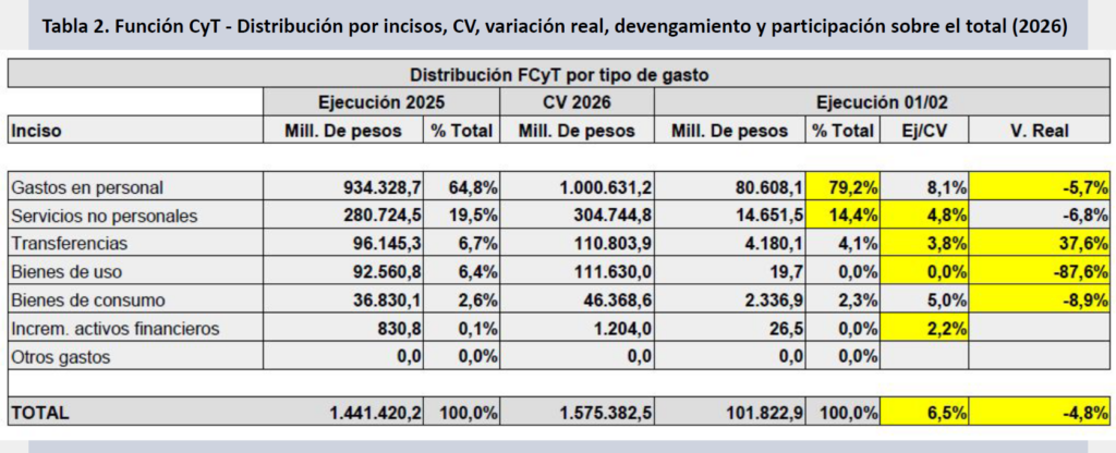 - Salarios y becas representan en 2026 el 93,6% de la Función CyT ejecutada (84,3% en 2025 y 81,9% en 2024). El inciso salarial ejecutado durante el año en el ámbito de la Función CyT permite proyectar un déficit presupuestario de 75 mil millones de pesos para el conjunto del SNCTI en el Crédito Vigente 2026.