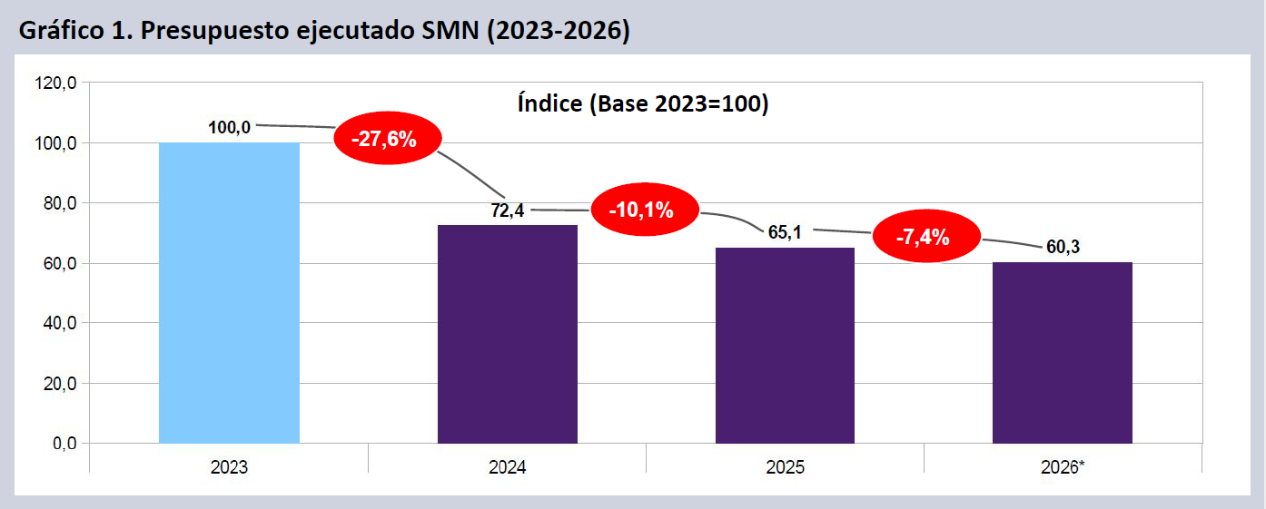 Desde 2023 el SMN sufrió un recorte del 39,7% en términos reales. Tras sufrir un ajuste del 27,6% en 2024 y del 10,1% en 2025, este año el presupuesto vigente del SMN se deteriora un 7,4%.