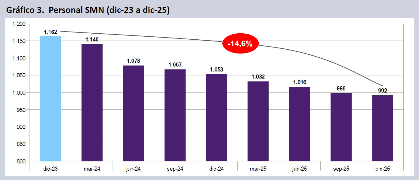 El ajuste también impacta en la dotación de personal del SMN, que había permanecido estable hasta 2023. El SMN perdió el 14,6% de su planta entre dic-23 y dic-25, situándose entre los más afectados por el ajuste en el SNCTI.
