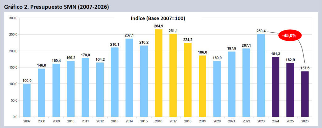 Cuando se mide su crédito disponible, la caída es mayor aún (45,0% real en tres años), devolviendo al SMN a niveles de 2008. No es la primera vez que el organismo sufre recortes que revierten su desarrollo institucional.